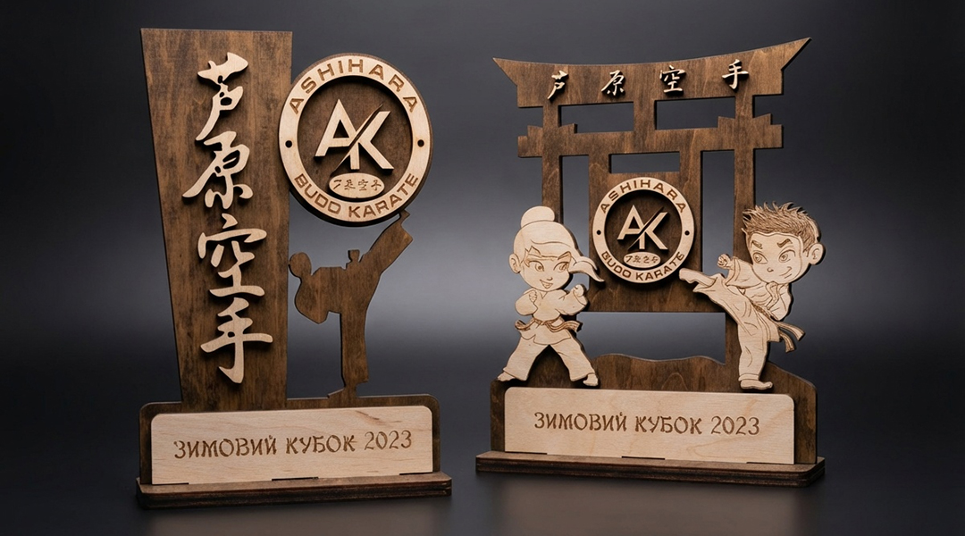 Цей проект демонструє можливості створення унікальної нагородної атрибутики для організаторів заходів. Завдяки багатошаровій конструкції з фанери ми надали кубкам глибини та об’єму, а використання лазерного різання з точністю до 0,1 мм дозволило філігранно відтворити логотип «AK» та динамічні фігури спортсменів. Поєднання японської естетики, натуральної текстури дерева та персоналізованого гравіювання перетворило ці нагороди на справжній символ спортивної дисципліни та поваги, що повністю перевершив очікування замовника.