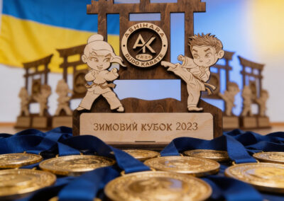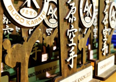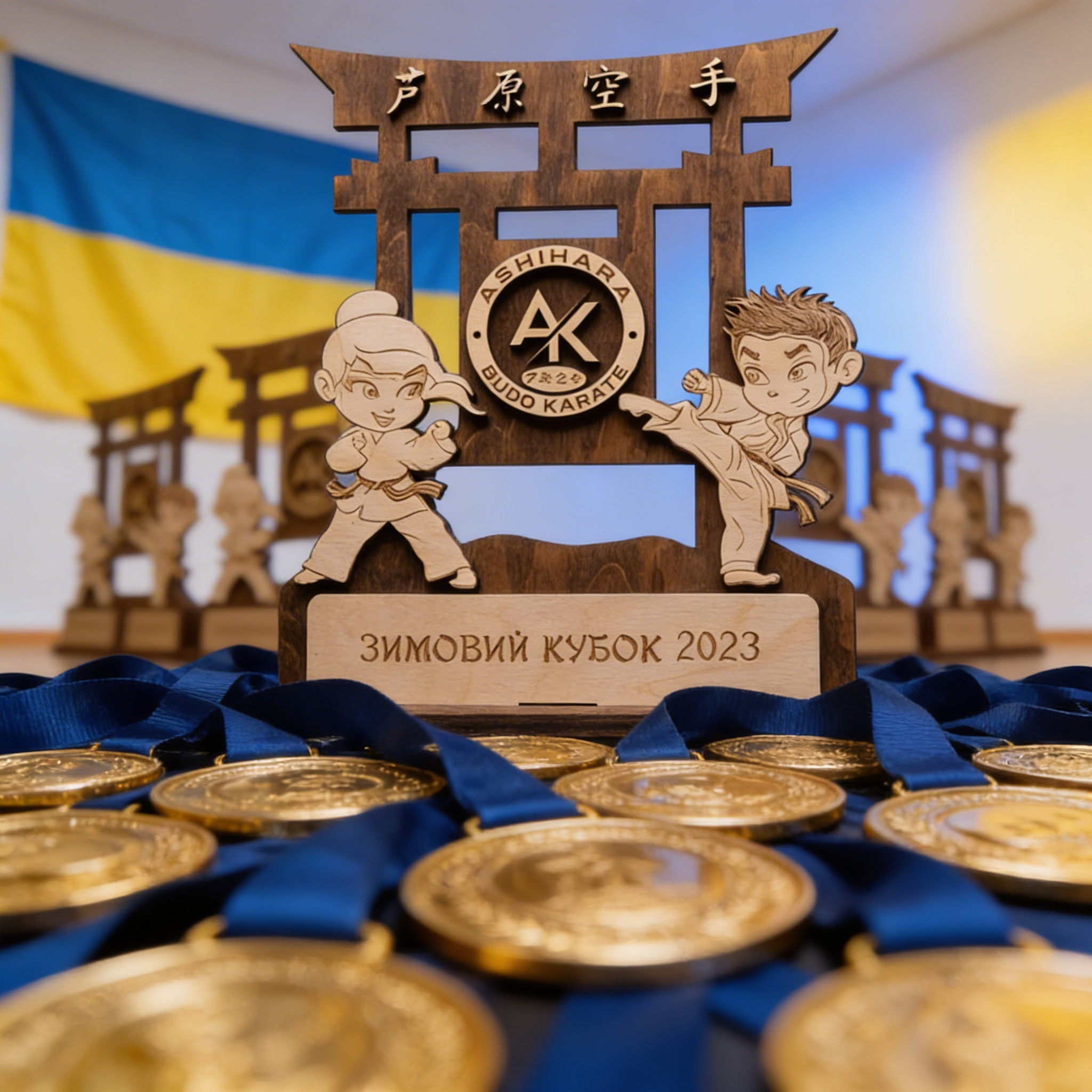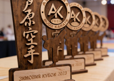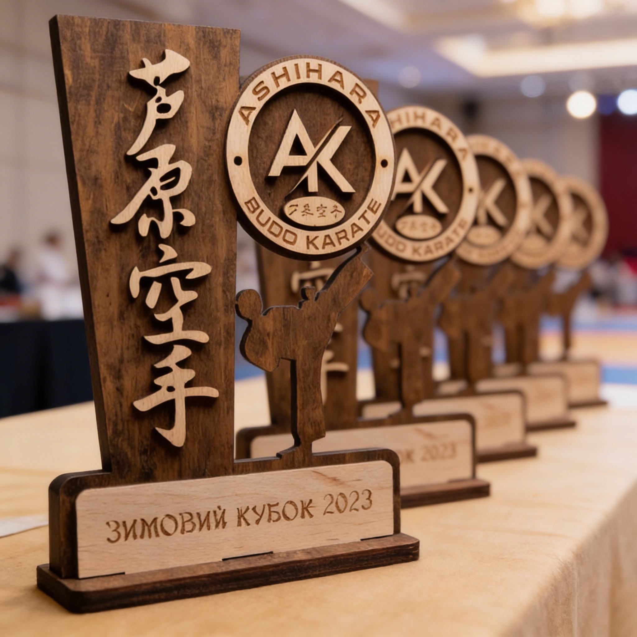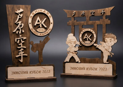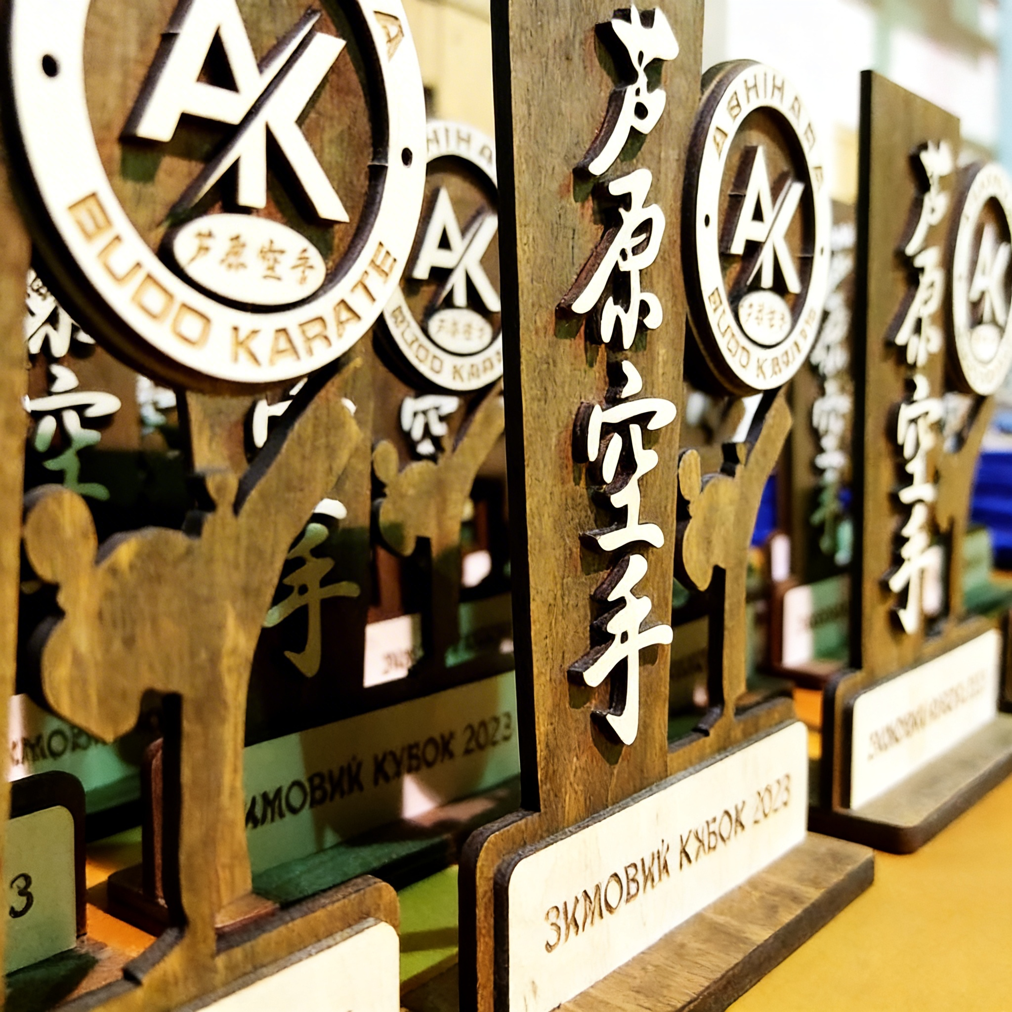 Авторські дерев’яні кубки для дитячих турнірів з карате. Індивідуальний дизайн під подію.